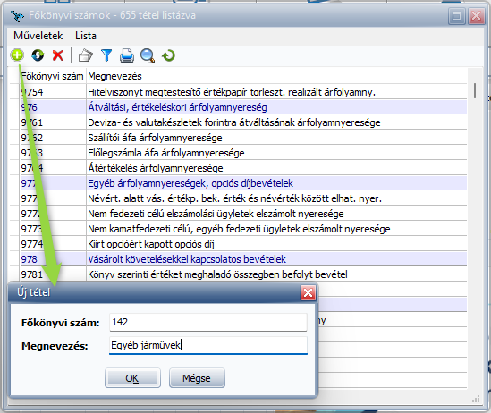 1. Kérje le a számlatükröt a tárgyi  programból, a Nyilvántartás / Főkönyvi számok menüpontjának kiválasztásával. Új főkönyvi számot az Új ikonra kattintva vihet fel.
