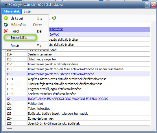 2. Ha a tárgyi és a könyvelő program ugyanazon a számítógépen lett telepítve, a számlatükröt egy lépésben importálni is lehet a Könyvelő programból. Ehhez első lépésként kérje le a számlatükröt (Nyilvántartás / Főkönyvi számok menüpont), a Művelet menüből válassza az Importálás lehetőséget