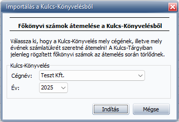 3. A megjelenő panelen adja meg, hogy mely cég mely évéből szeretné átvenni a főkönyvi számokat, majd kattintson az Indítás gombra