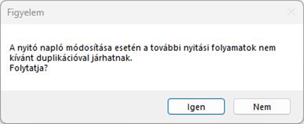 A zárás és nyitás folyamata – felmerülő igény esetén – megismételhető. A Nyitó / Nyitó pénzügyi / Záró naplók részleges törlése vagy módosítása esetén a következő nyitási folyamat elindítása duplikációkat okozhat. Erre a rendszer figyelmeztető üzeneteket is küld az alábbiak szerint: