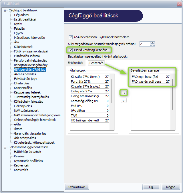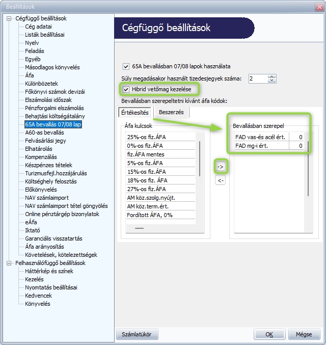 A Beállítások/Alapbeállítások/65A bevallás 07/08 lapok menüpontban be kell kapcsolni a funkció használatát, majd ki kell választani azon áfa-kulcsokat, amelyikhez szeretnénk vtsz és súly adatokat rögzíteni. Itt van lehetőségünk azt is beállítani, hogy hibrid vetőmag jelölést szeretnénk-e alkalmazni.