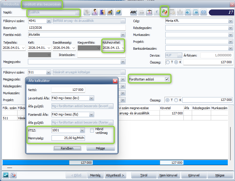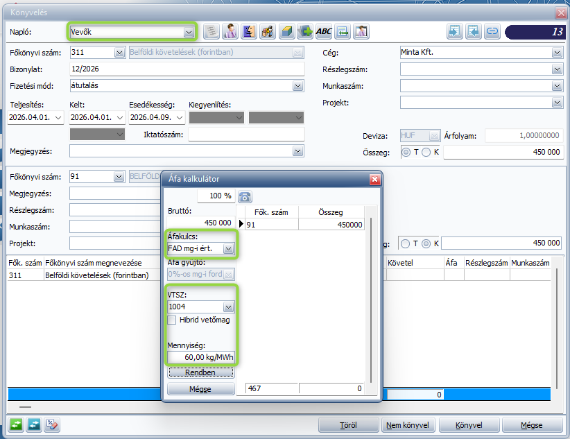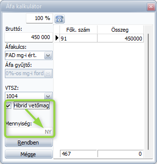 Amennyiben rögzítéskor az előző pontban beállított áfa-kulcsot választjuk, akkor kötelező a vtsz és a súly adat kitöltése az áfa-kalkulátoron. Lehetőség van a mezőgazdasági VTSZ szám választása esetén hibrid vetőmagnak jelölni a kapcsolódó beszerzés / értékesítés tételeit, amennyiben a mezőgazdasági termék külön jogszabály szerint hibrid vetőmagnak minősül, és erről a tényről a terméket értékesítő / beszerző nyilatkozik. A jelölés alapértelmezetten nem kerül bepipálásra. Alkalmazása esetben a mennyiségről nem kell nyilatkozni, így a súly adat megadás inaktívvá válik és a súlyadat helyett egy "NY" betű töltődik a bevallás (e) oszlopba.