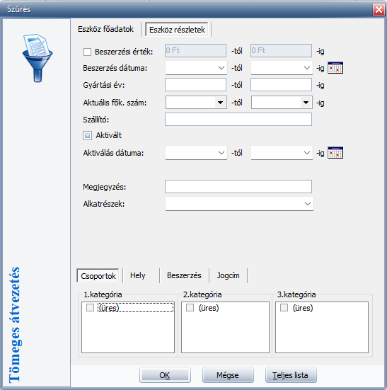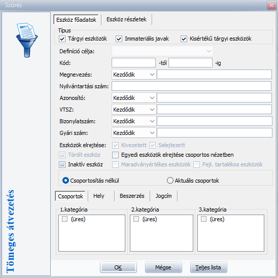 Ezt követően a szűrőablakban megadhatjuk a szükséges paramétereket azokra az eszközökre vonatkozóan, amelyeket tömegesen szeretnénk átvezetni:
