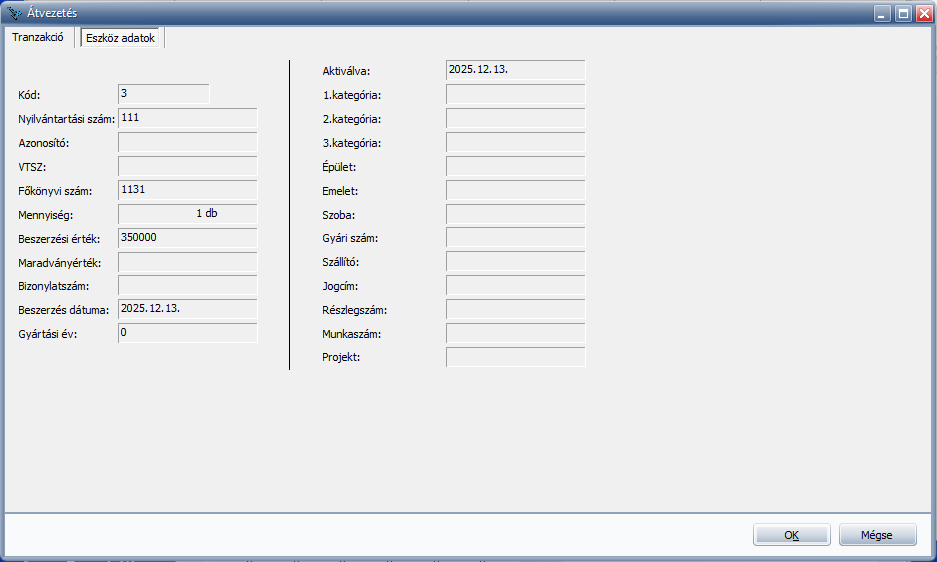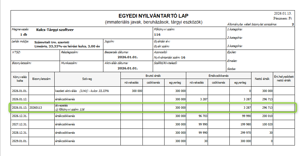 Az átvezetés tranzakció az érintett eszközök kartonján is rögzítésre kerül.