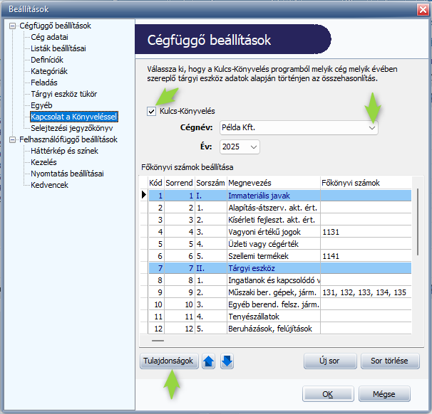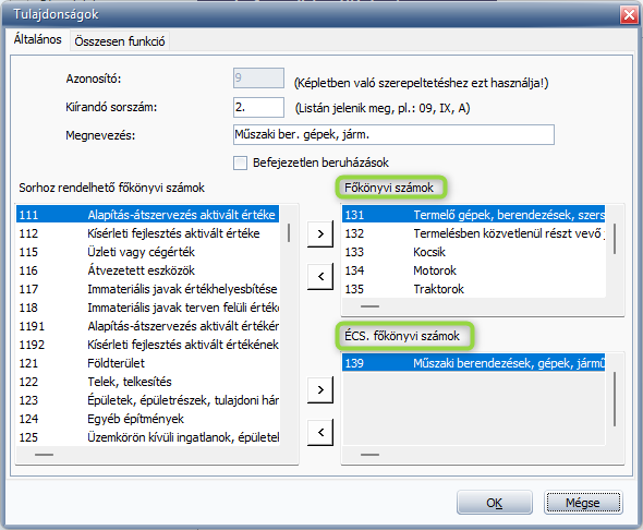 • a Tulajdonságok gombra kattintva a főkönyvi számok besorolása a megfelelő mezőbe