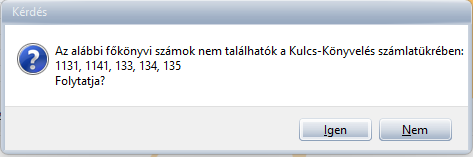 A beállításokat követően futtatható a funkció. Ha a program eltérést talál az ellenőrző lista beállításaiban megadott és a Kulcs-Könyvelés számlatükrében szereplő főkönyvi számok között, akkor erre egy üzenetben hívja fel a figyelmet. A jelzett főkönyvi számokat célszerű pótolni a Kulcs-Könyvelésben.
