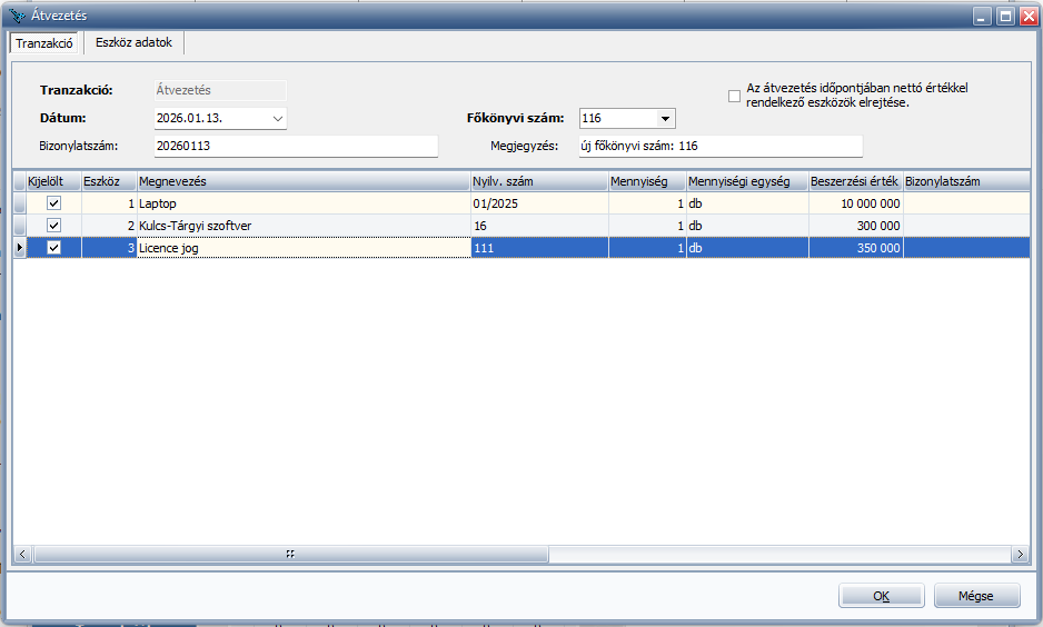 Új funkció: Eszközök tömeges átvezetése egy másik főkönyvi számra
