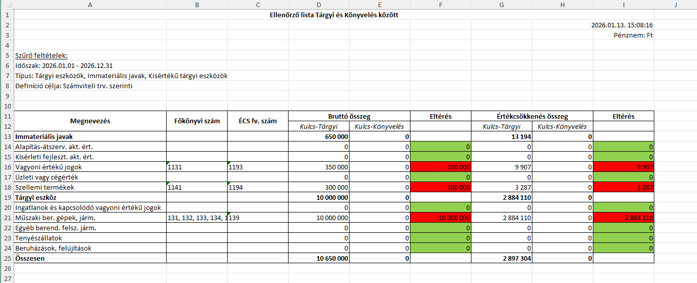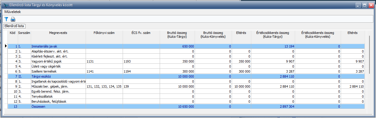 Az ellenőrző lista megmutatja, hogy az egyes sorok szerint a Kulcs-Tárgyiban és a Kulcs-Könyvelésben milyen bruttó és értékcsökkenés összegek kerültek rögzítésre, valamint az adatok közt milyen eltérések mutatkoznak.