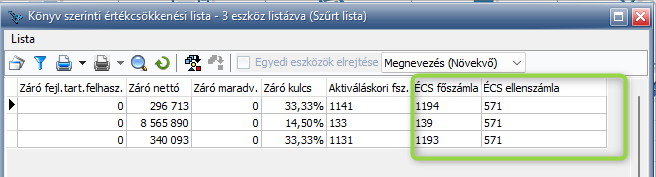 Az eszközök listáján és a könyv szerinti értékcsökkenés listán a nyomtatható oszlopok közé bekerült az ÉCS főszámla és az ÉCS ellenszámla.