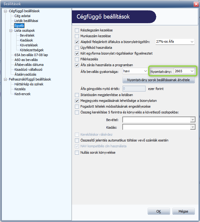 Első lépésként a Karbantartás/Beállítások/Cégfüggő beállítások/Egyéb menüpontban ki kell választani a 2665-ös nyomtatványt. Amennyiben az új verzióval alapparaméterezett céget/vagy évet hozunk létre, akkor a 2026-os adatbázis évben automatikusan a 2665-ös nyomtatvány kerül kiválasztásra.
