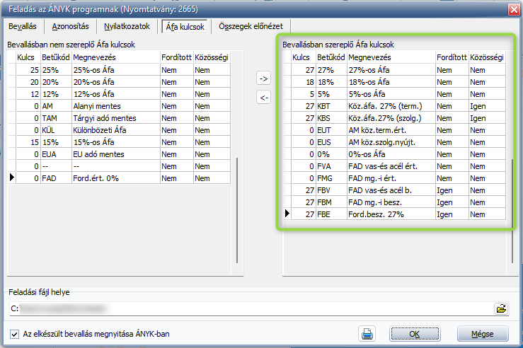 A bevallás a Karbantartás/Feladás az ÁNYK programnak/2665-ös nyomtatvány menüpontban készíthető el. A menüpontban az alapadatok megadása után ellenőrizni szükséges az Áfa kulcsok fülön, hogy minden olyan áfa kulcs szerepel-e a Bevallásban szereplő Áfa kulcsok szekcióban, amire történt könyvelés.