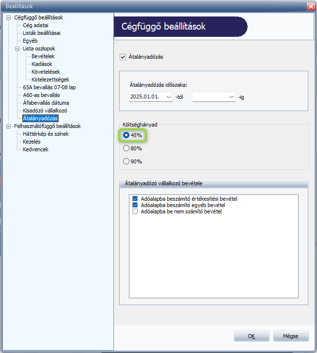 Átalányadó esetén a korábbi 40%-os költséghányad 45%-ra emelkedett 2026-ban. Az Egyszeres szoftver Karbantartás/Beállítások/Cégfüggő beállítások/Átalányadó menüpontjában is átvezetésre került a százalék változás, mely csak a 2026-os adatbázis évtől kezdődően érvényesül.