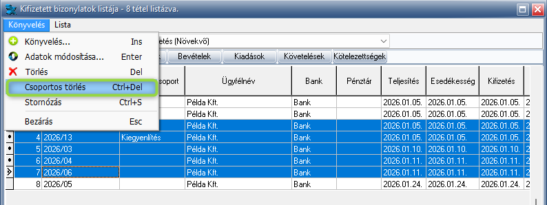 A bizonylatok kiválasztása után a Könyvelés/Csoportos törlés menüpontban indítható el a művelet. (illetve a jobb egérgombbal is elérhető a funkció)