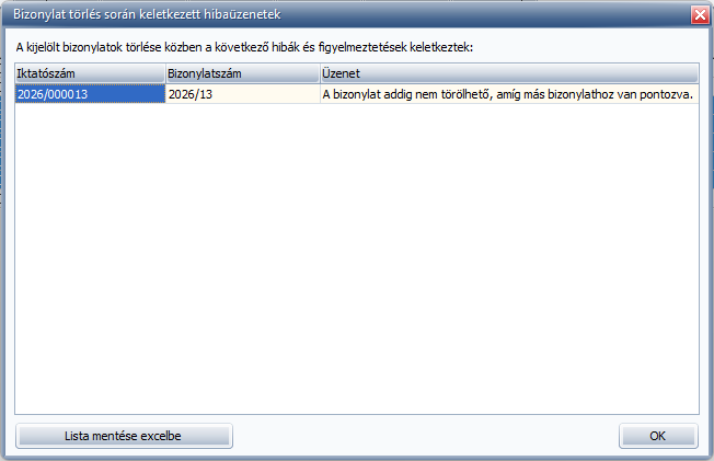 A törlés folyamán ellenőrzésre kerül, hogy a kijelöltek között vannak-e olyan bizonylatok, melyek nem törölhetőek. Amennyiben igen, úgy arról tájékoztató üzenetet küld a szoftver: