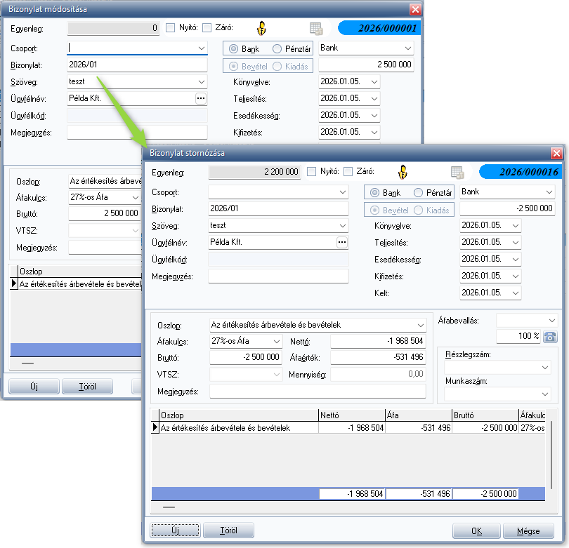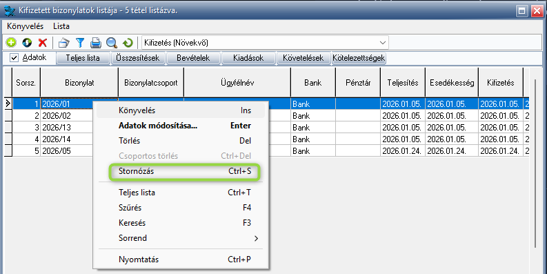 Elérhetővé vált a stornózás lehetősége a Bizonylatok listája, illetve a Ki nem fizetett bizonylatok listája menüpontban. Amennyiben az egyik már felrögzített bizonylathoz stornó számla érkezik, akkor az eredeti bizonylaton állva a jobb egérgombos menüpontok között vagy a Könyvelés/Stornózás opcióval kiválasztható a sztornó funkció, mellyel a bizonylat stornója egy kattintással lerögzíthető.