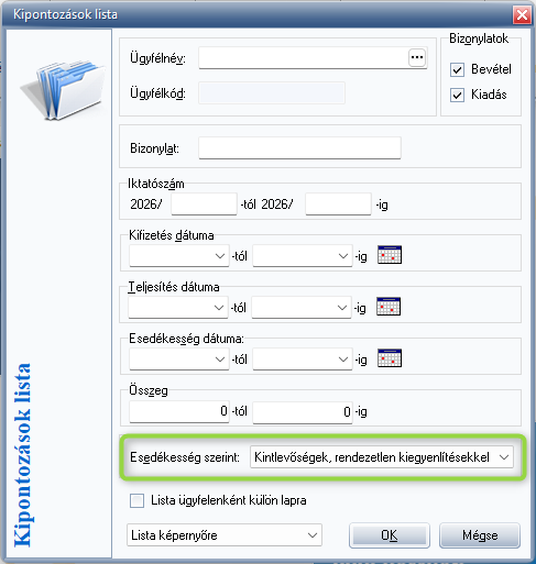 A Kipontozások lista szűrőablakában már megadható szűrőfeltételként a "Kintlévőségek, rendezetlen kiegyenlítésekkel" opció, mellyel egy listán kérdezhetők le a kintlévőséges kipontozandó számlák és a kiegyenlítésként felrögzített banki és pénztári tételek, melyek nem lettek még számlához pontozva (pl.: előre fizetések).