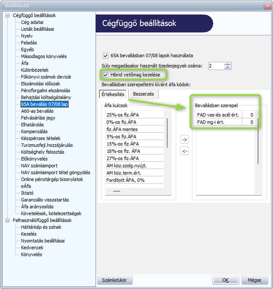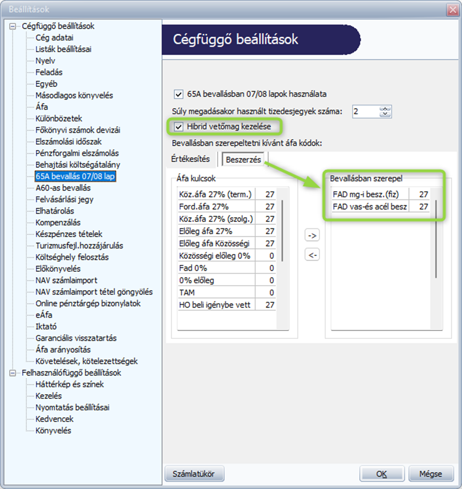 A Karbantartás/Beállítások/Cégfüggő beállítások/65A bevallás 07-08 lap menüpontban kapcsoljuk be a használatot, majd az Értékesítés és a Beszerzés fülön is válasszuk ki azokat az áfakulcsokat, amikhez szeretnénk VTSZ és súly adatot, vagy hibrid vetőmag megjelölést megadni, ezáltal szerepeltetni az áfa bevallás 07/08-as lapján. Beállítható továbbá az is, hogy könyveléskor a súly hány tizedessel legyen megadható. A bevallás elkészítésekor a program automatikusan lekerekíti egész számra a megadott súlyokat. Fontos, hogy a kiválasztott áfakulcshoz kötelező lesz megadni a könyvelés során a VTSZ és súly /hibrid vetőmag adatokat.