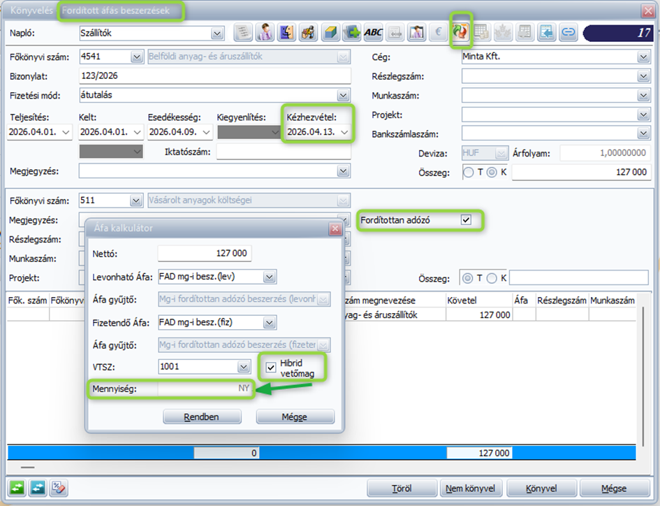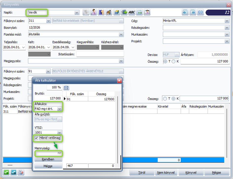 Fordítottan adózó áfakulcs esetén, lehetőség van a Könyvelő program új verziójában már a mezőgazdasági VTSZ szám kiválasztása mellett a hibrid vetőmag jelölést megtenni, amennyiben a mezőgazdasági termék külön jogszabály szerint hibrid vetőmagnak minősül, és erről a tényről a terméket értékesítő / beszerző nyilatkozik. A jelölés alapértelmezetten nem kerül bepipálásra. Alkalmazása esetén a mennyiségről nem kell nyilatkozni, így a súly adat megadás inaktívvá válik és a súlyadat helyett egy "NY" betű töltődik a bevallás (e) oszlopba.