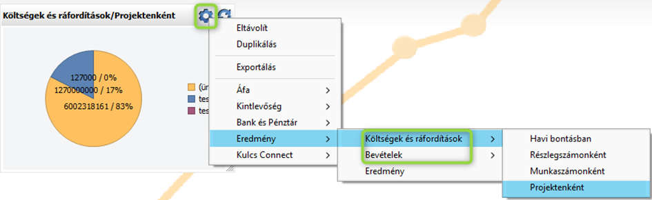 Beállítások ikonra kattintva az Eredmény / Költség és ráfordítások / Projektenként, valamint az Eredmény / Bevételek / Projektenként lehetőséggel tudjuk megjeleníteni a kapcsolódó grafikonokat.