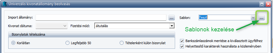 A cél adatbázisban állva a Könyvelés / Banki kivonatállományok beolvasása / Univerzális kivonatállomány beolvasása menüpontban lehetővé vált másik cégből vagy adatbázis évből is átimportálni a korábban már létrehozott banki kivonatállomány sablonunkat.