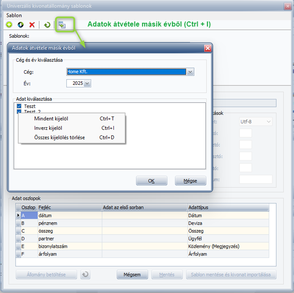 A megjelenő cégválasztóban lehetőségünk van kiválasztani a forrás céget és annak évét ahonnan a sablont másolni szeretnénk. Alapértelmezetten az összes megjelenő sablon kipipálásra kerül, de a jobb egérgomb megnyomása mellett az Összes kijelölés törlése / Inverz kijelöl / Mindent kijelöl opciók is megjelennek. Az OK gomb megnyomásával a kiválasztott sablon kerül majd másolásra.