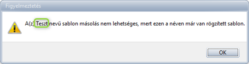 Abban az esetben, ha a felhasználó egy olyan nevű sablon elemet választ ki, amely már szerepel a cél adatbázisban, akkor az alábbi figyelmeztető üzenetet jeleníti meg a program: