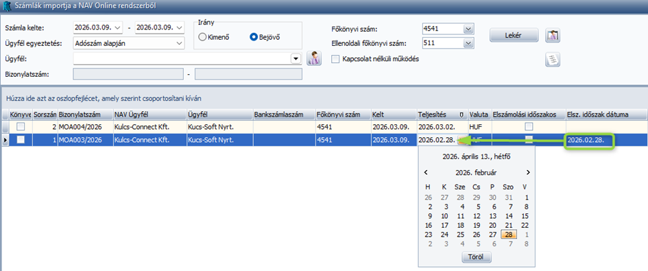 Amennyiben a bizonylat elszámolási időszakosként került feltöltésre a NAV rendszerébe és megadásra került az elszámolási időszak záró dátuma, akkor a Teljesítés dátumba alapértelmezetten ez a dátum került kiválasztásra.