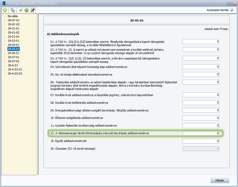 A 05-01-es lap az adókedvezmények egy új sorral bővültek: 12. A villamosenergia-tároló létrehozására irányuló beruházás adókedvezménye.