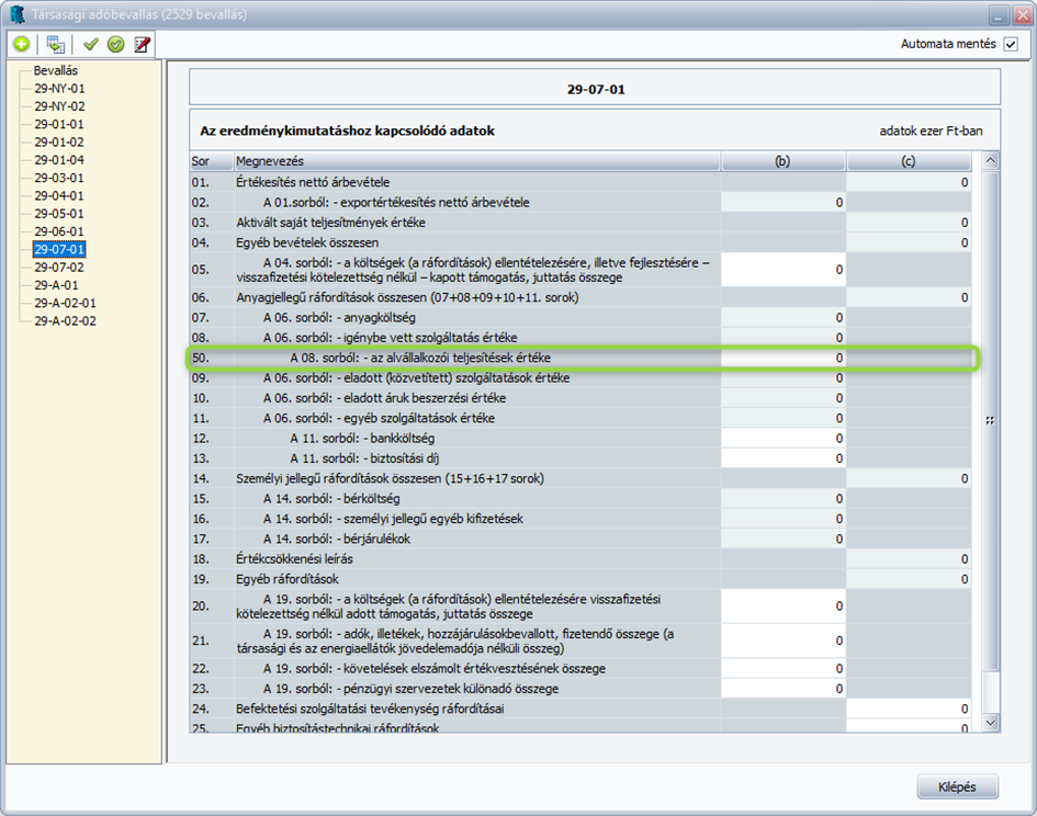 A 07-01-es lapon az eredménykimutatáshoz kapcsolódó adatok egy új sorral bővültek: 50. sor A 08. sorból: - az alvállalkozói teljesítések értéke.