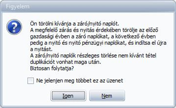 Abban az esetben, ha nem kerül törlésre az összes Nyitó / Záró napló, akkor a következő nyitási folyamat elindítása duplikációkat okozhat. A Nyitó / nyitó pénzügyi / záró naplók törlése során az alábbi figyelmeztető üzenet jelenik meg, mely kiegészítésre került a részleges törlésre vonatkozó figyelmeztetéssel.